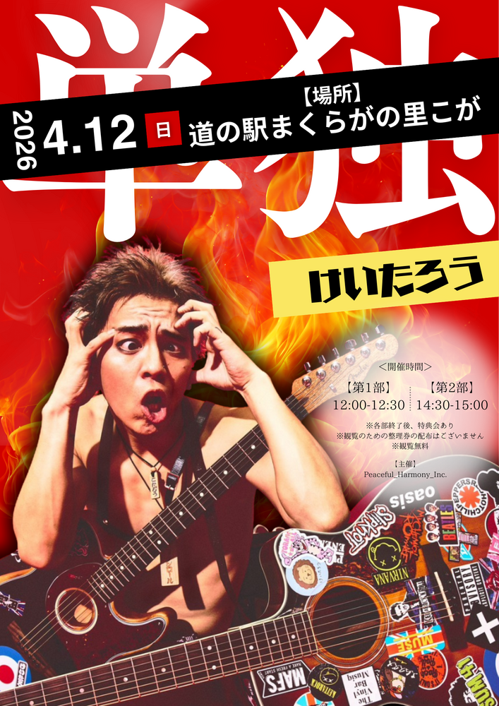 12(日)@道の駅まくらがの里こが 単独フリーライブ(茨城) SCHEDULE 2026/04/12(日) 🔥🎸 けいたろう 単独フリーライブ決定! 🎸🔥 📅 2026年4月12日(日)📍 【場所】 道の駅まくらがの里こが(茨城) 🕛 開催時間【第1部】12:00〜12:30【第2部】14:30〜15:00 ※各部終了後、特典会あり※整理券配布なし※観覧無料 URLをコピーする 報告する