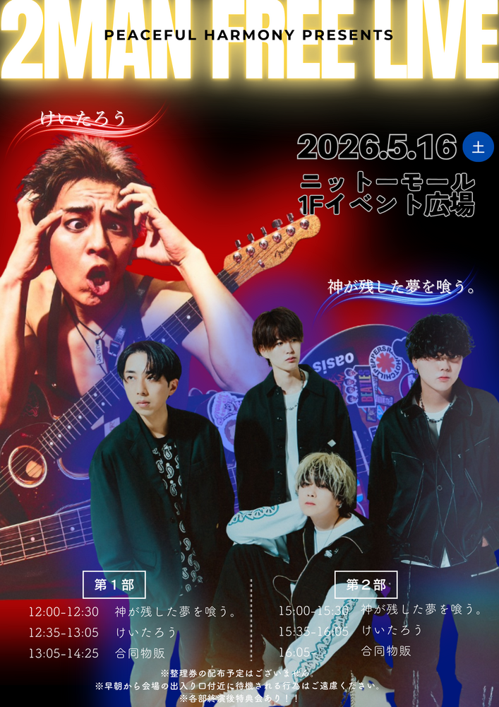 16(土)@ニットーモール 1Fイベント広場 フリーライブ(埼玉・熊谷) SCHEDULE 2026/05/16(土) 🎸🔥 2MAN FREE LIVE 🔥🎸 2026.5.16(土)ニットーモール 1Fイベント広場 【けいたろう出演時間】🕛第1部12:35〜13:05 🕒第2部15:35〜16:05 観覧無料✨合同物販あり 神が残した夢を喰う。との2マン🔥ぜひ応援に駆けつけてください✨ URLをコピーする 報告する